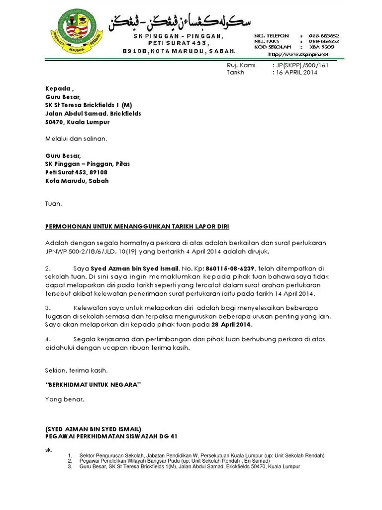 Makluman dan permohonan penangguhan tarikh melapor diri. Contoh surat rasmi penangguhan lapor diri surat tangguh tugas pertukaran serv cuitan .